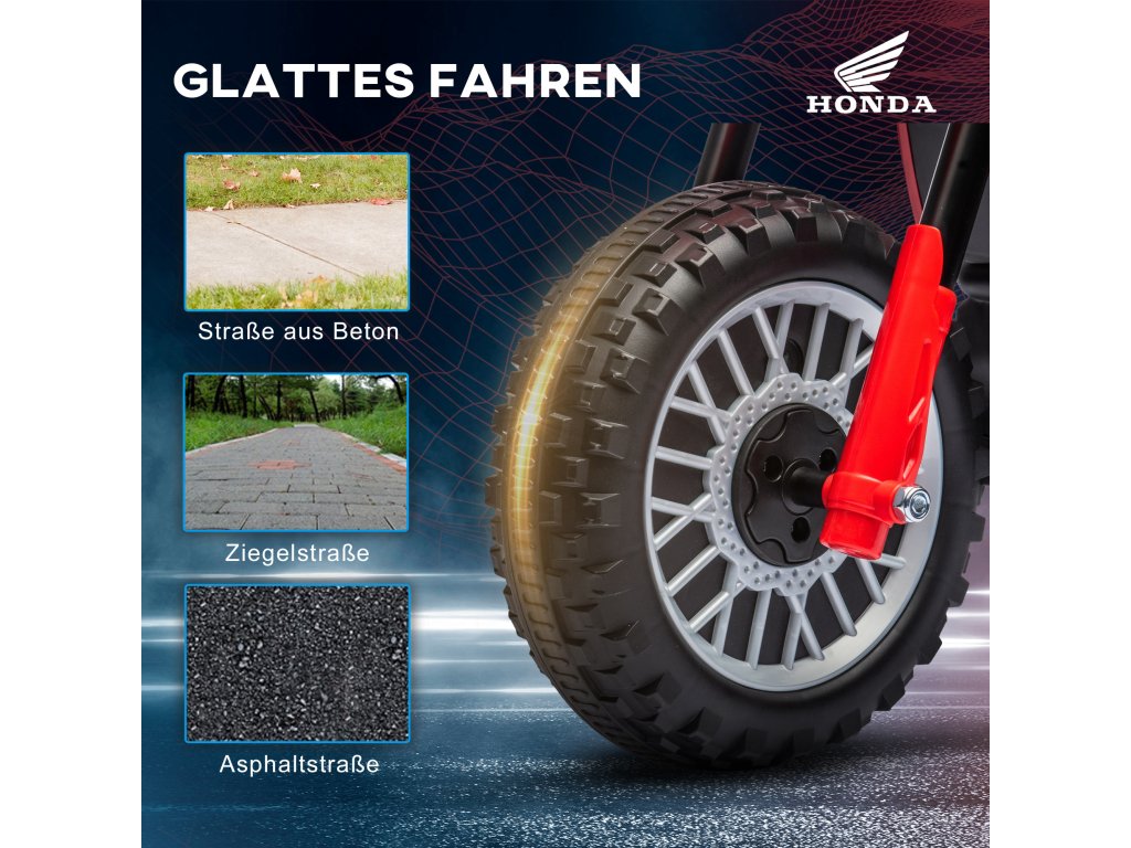 Zažijte nekonečnou zábavu na chopperu s touto dětskou elektrickou motorkou. Ať už jemně klouže po asfaltu, uhání po dlažebních kostkách nebo křižuje betonové cesty - tato elektrická motorka slibuje vzrušující dobrodružství pod značkou kvality Honda. Díky autentickým startovacím zvukům a klaksonu se každé dítě bude cítit jako skutečný motorkář. Bezpečná a kvalitní zábava při jízdě, která vytváří nezapomenutelné vzpomínky.