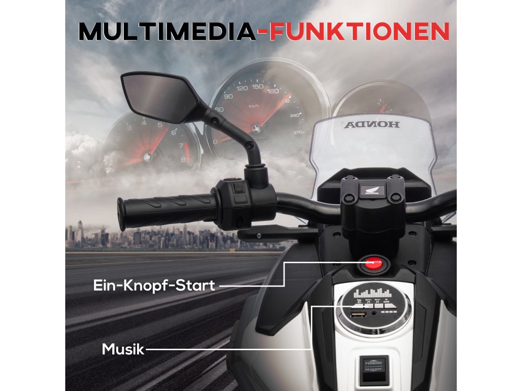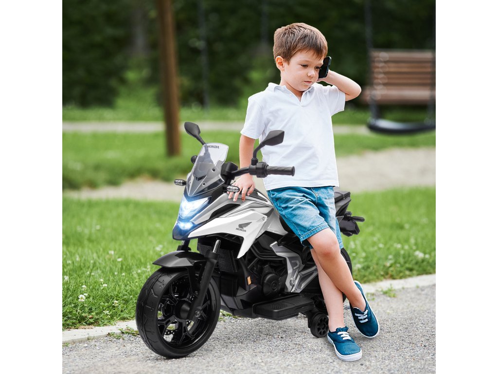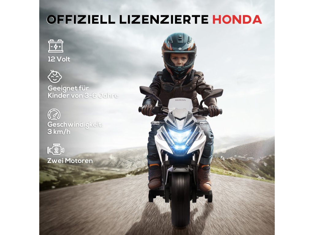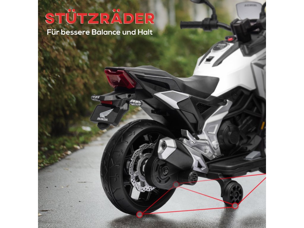 S elektrickou motorkou s licencí Honda bude hraní ještě napínavější. Dobrodružství začíná pouhým stisknutím tlačítka: funkční světlomety a veselé melodie provázejí každou jízdu. Opěrná kolečka, která jsou součástí dětské elektrické motorky, jsou speciálně navržena pro asfalt, cihly nebo beton a zajišťují bezpečnou a vzrušující jízdu rychlostí 3 km/h. Vzrušující zážitek pro malé závodníky!
