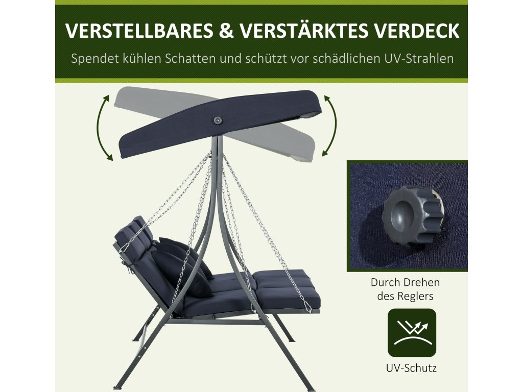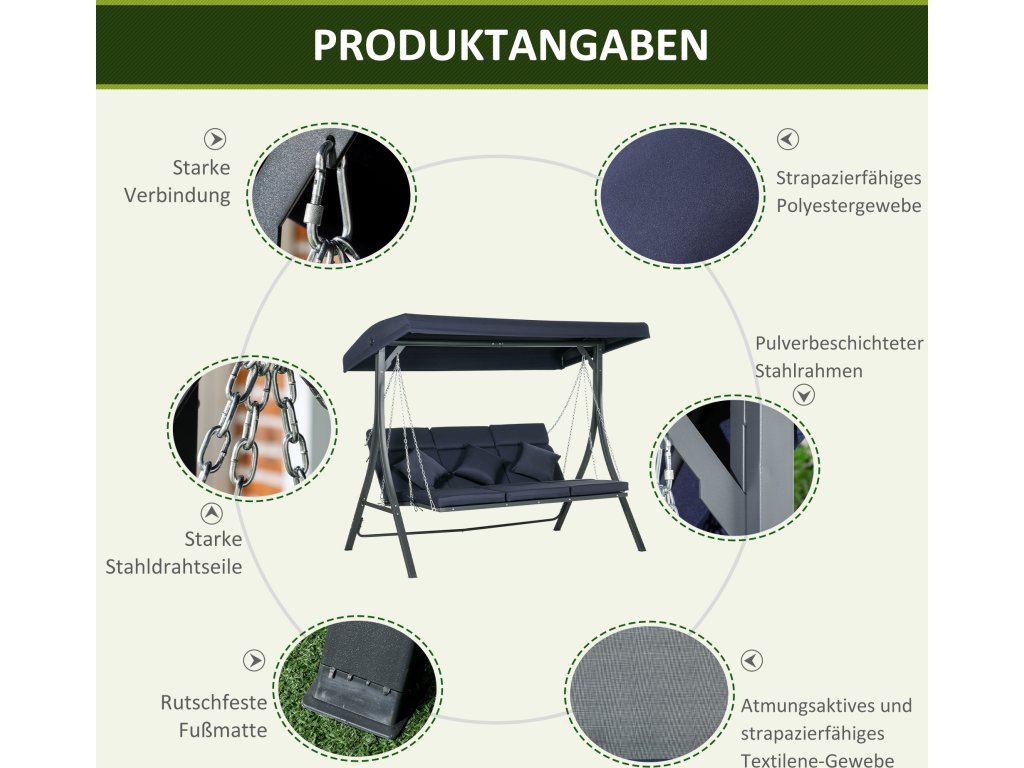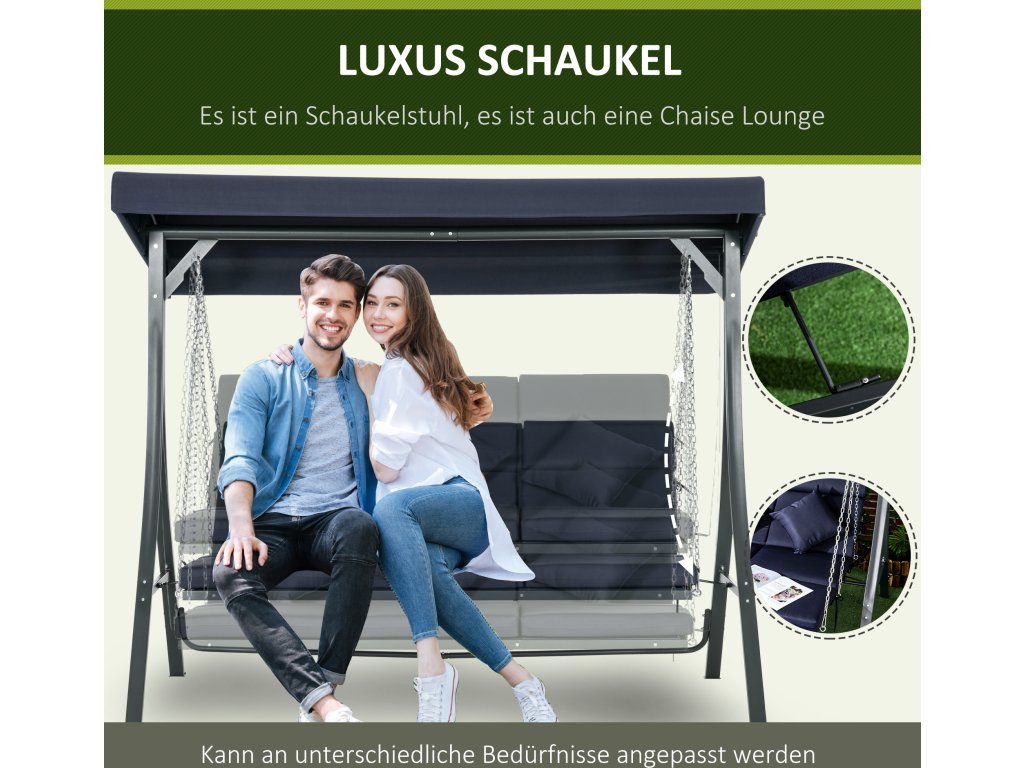 Užijte si hodiny odpočinku venku s přáteli a rodinou na naší stylové zahradní houpačce. Na prostorné lavici se pohodlně usadí tři osoby a její vyvážený design harmonicky zapadne do Vaší zahrady. Nastavitelná sluneční stříška poskytuje v horkých dnech příjemný stín a zajišťuje bezstarostné houpání. Opřete se, zhluboka se nadechněte a užívejte si jemné houpání v blahodárném letním vánku.