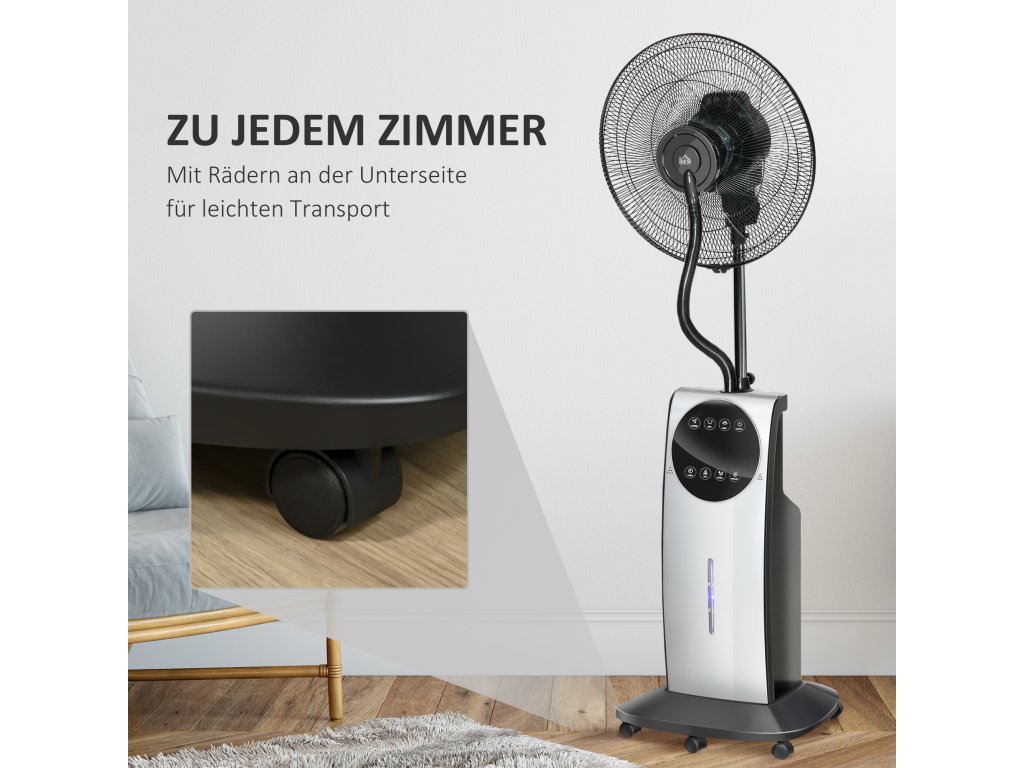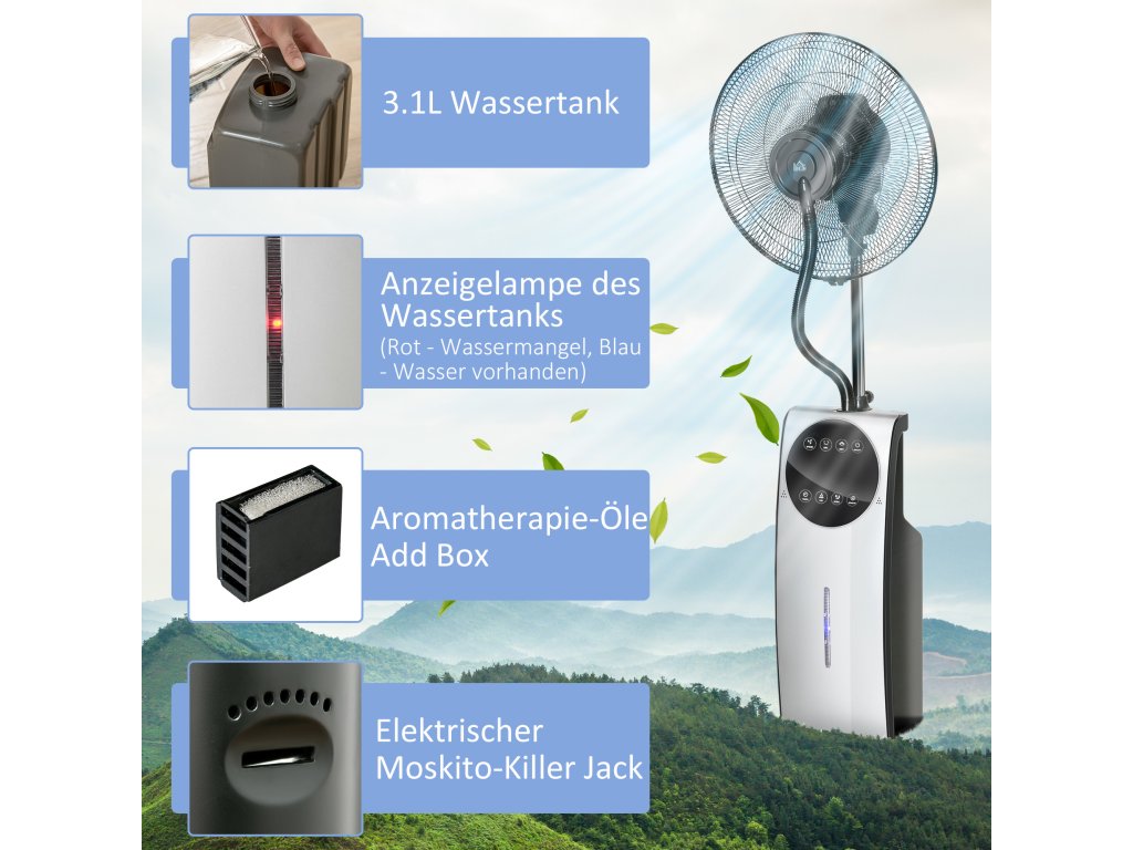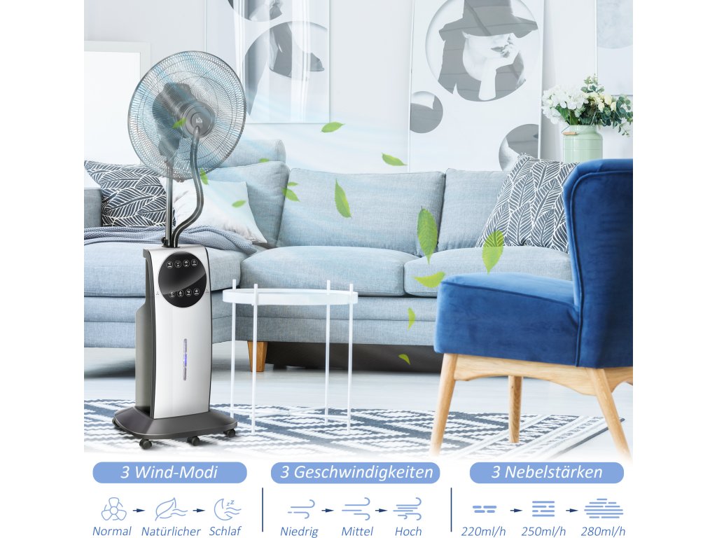 Tento podstavný ventilátor s funkcí mlžení Vás potěší. Díky nádržce na vodu o objemu 3,1 litru a závěrečnému mlžítku si můžete vychutnat ideální a osvěžující vlhkost v místnosti, kam jej chcete umístit. Díky dálkovému ovládání mlhovače již nemusíme vstávat z pohovky abychom si vytvořili příjemné prostředí.