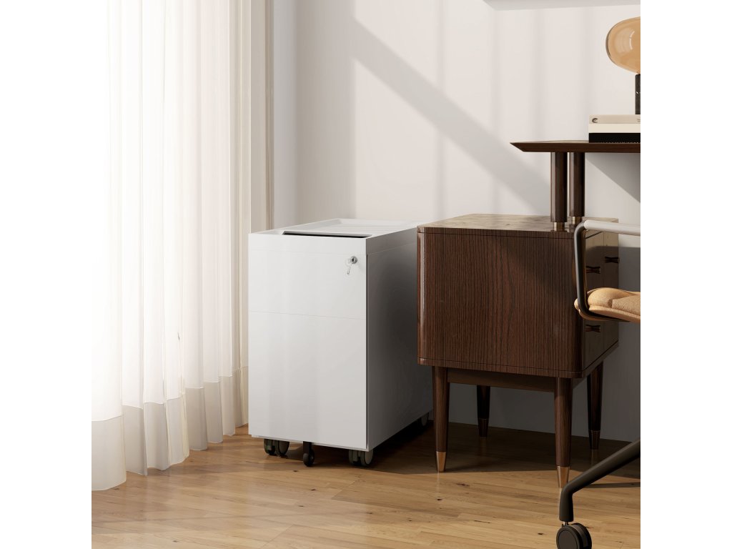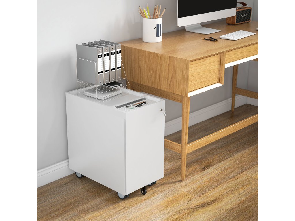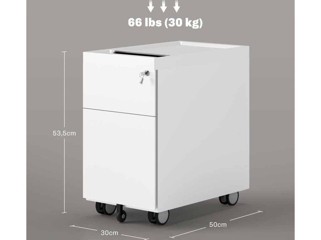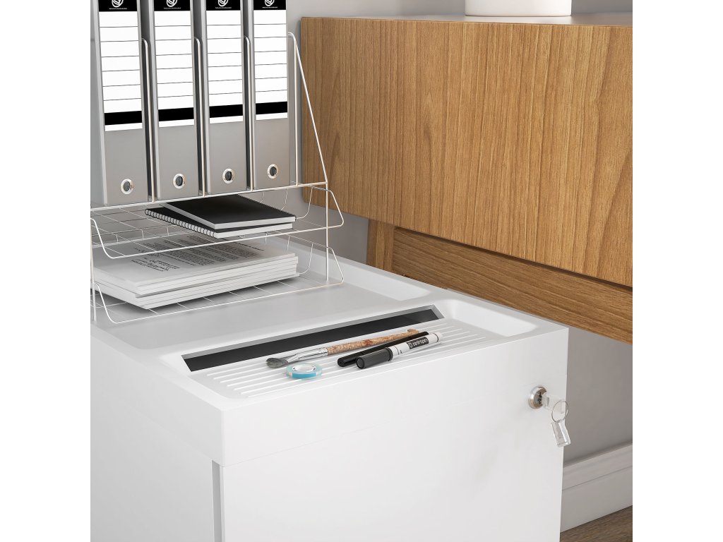 Uchovávejte své dokumenty v bezpečí a stylově díky skříni na kolečkách se 3 zásuvkami. Horní zámek zajišťuje obě zásuvky současně, zatímco zasouvací otvor umožňuje vkládání dokumentů i při uzamčení. Díky čtyřem kolečkům můžete kancelářský stolek se zásuvkami bez námahy přemisťovat a v případě potřeby jej zajistit brzdami. Užijte si uklizené pracovní prostředí s moderním šmrncem!