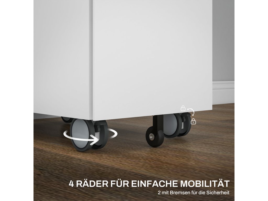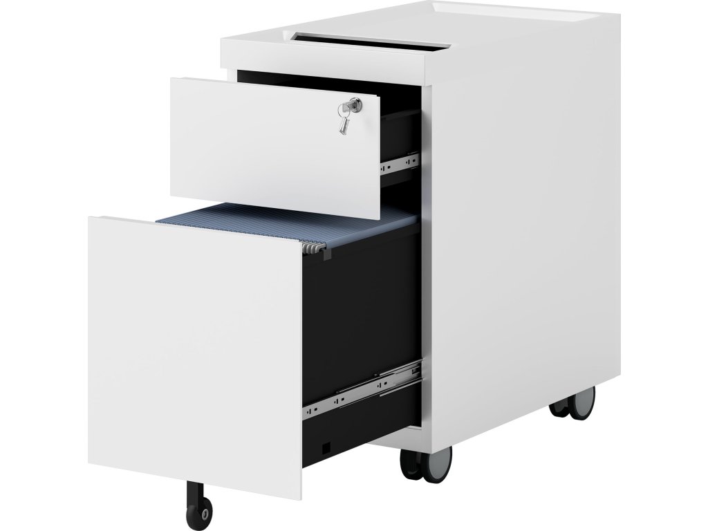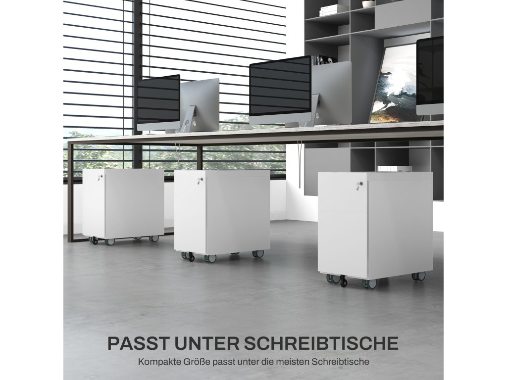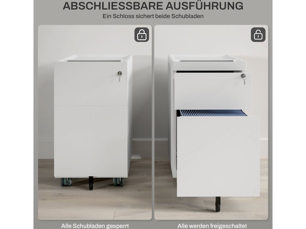 Uchovávejte své dokumenty v bezpečí a stylově díky skříni na kolečkách se 3 zásuvkami. Horní zámek zajišťuje obě zásuvky současně, zatímco zasouvací otvor umožňuje vkládání dokumentů i při uzamčení. Díky čtyřem kolečkům můžete kancelářský stolek se zásuvkami bez námahy přemisťovat a v případě potřeby jej zajistit brzdami. Užijte si uklizené pracovní prostředí s moderním šmrncem!