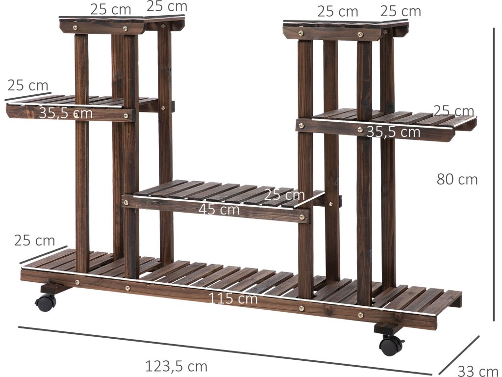 Pojízdný dřevěný stojan na květiny 123,5 × 33 × 80 cm | tmavě hnědý