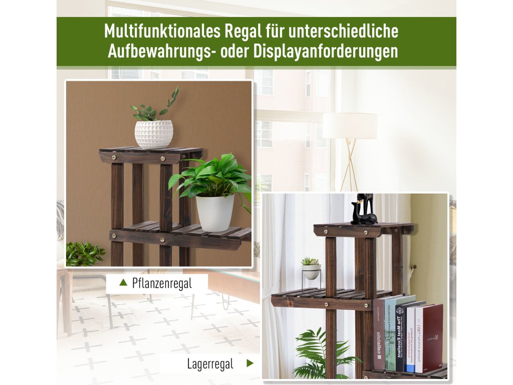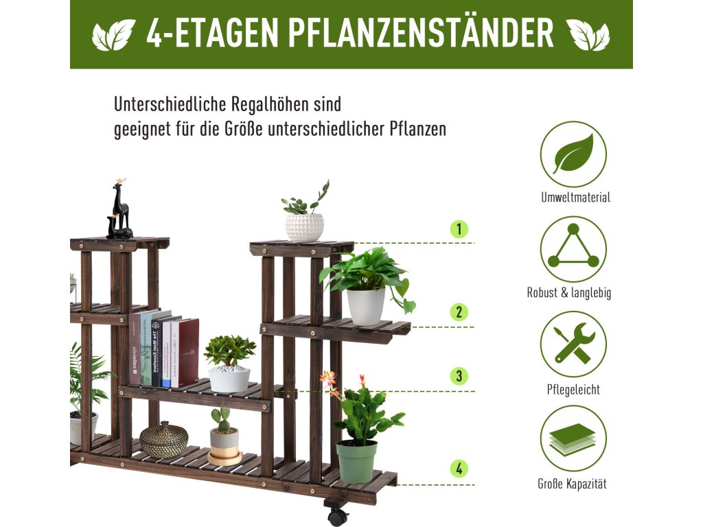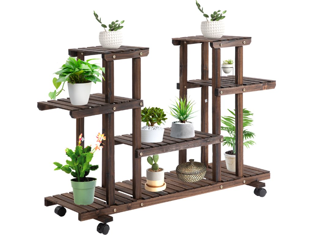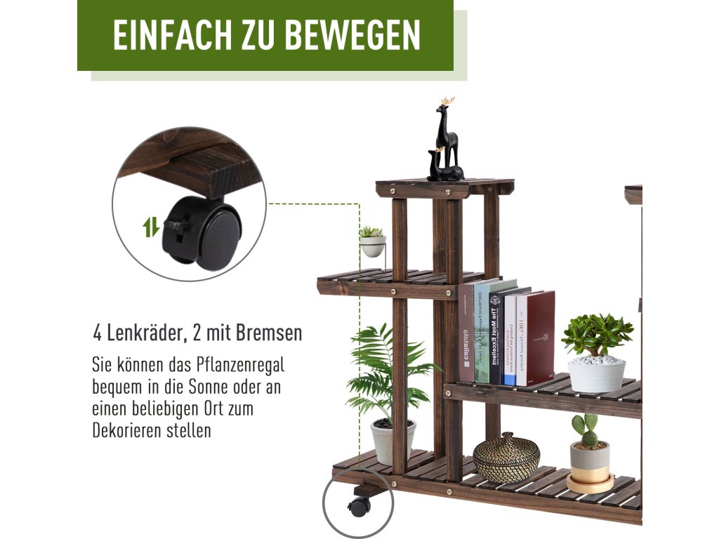 Toto mobilní květinové schodiště pojme až 8 květináčů. Rostlinný žebřík je díky svým 4 kolům mobilní a lze jej snadno přemisťovat z místa na místo. Pro pevný a bezpečný stojan jsou 2 kolečka vybavena parkovací brzdou. Ať už uvnitř nebo venku – toto květinové schodiště je ideálním místem pro uložení vašich rostlin. Ale toto květinové schodiště se dobře hodí i jako police pro venkovní použití.